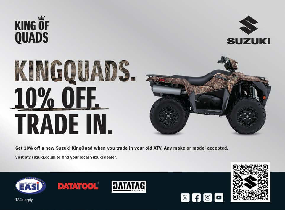 Suzuki GB are offering a fantastic new trade-in offer on its range of KingQuad ATVs which will enable customers to get 10% off the RRP of a new Suzuki by trading in any brand of quad bike in part exchange